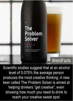 people), a moderate amount of alcohol is the actual cure for writer’s block. There is an amazing article, “Uncorking the muse: Alcohol intoxication facilitates creative problem solving,” by actual scientists Andrew F. Jarosz, Gregory J.H. Colflesh, and Jennifer Wiley. (I titled my blog post before I found this article, I swear.) Purchase students can access this article through the Purchase College Library; just search for the article. It is otherwise impossible to find online without paying for it. There are a few other articles that reference the study, and are good reads, on Medical Daily and The Huffington Post that support drinking, to a point, is good for creative thinking and problem solving (which can be useful in editing). I particularly like the Problem Solver Beer, which provides an accurate way to get to peak creativity.